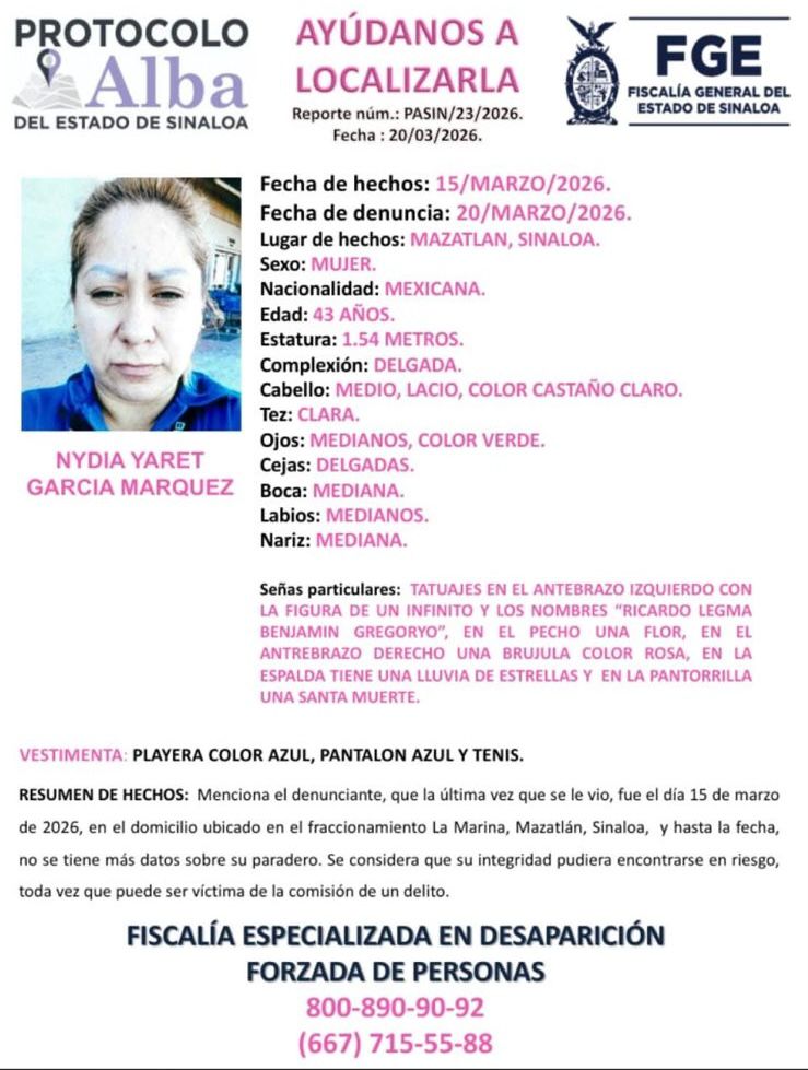 Culiacán, Sinaloa.- Una mujer identificada como Nydia Yaret García Márquez, de 43 años de edad, fue reportada como desaparecida en el municipio de Mazatlán, por lo que la Fiscalía General del Estado activó el Protocolo Alba para su localización.