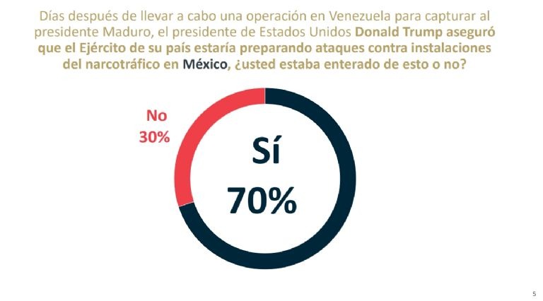 Al ser cuestionados sobre si estaban enterados de que, días después de llevar a cabo una operación en Venezuela para capturar al presidente Maduro, el presidente de Estados Unidos, Donald Trump, aseguró que el ejército de su país estaría preparando ataques contra instalaciones del narcotráfico en México, un 70 % señaló que estaba al tanto, frente a un 30 % que dijo que no lo estaba.