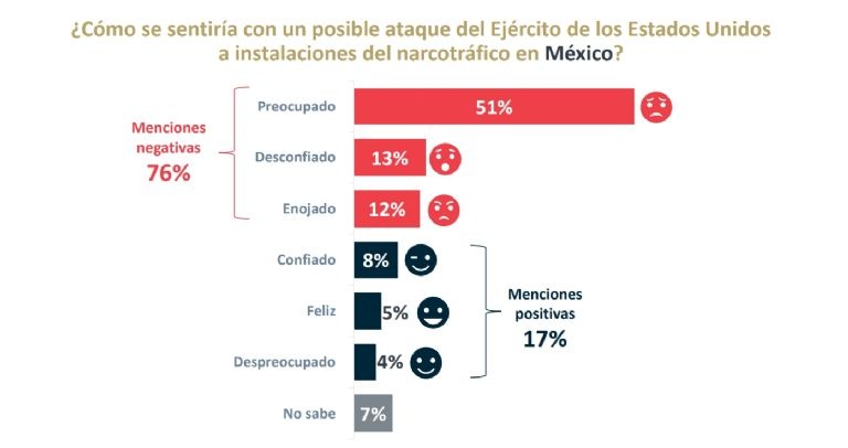 Finalmente, se les cuestionó si sentían preocupación por un posible ataque de Estados Unidos en territorio nacional: un 51 % se mostró muy preocupado, un 13 % desconfiado y un 12 % enojado.