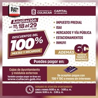 Culiacán, Sinaloa.- El Ayuntamiento de Culiacán invita a la ciudadanía a aprovechar la última semana de descuentos del 100 por ciento en multas, recargos y honorarios correspondientes al Impuesto Predial, ISAI, Estacionamientos Municipales, Mercados y Vía Pública, así como servicios del INMUVI.