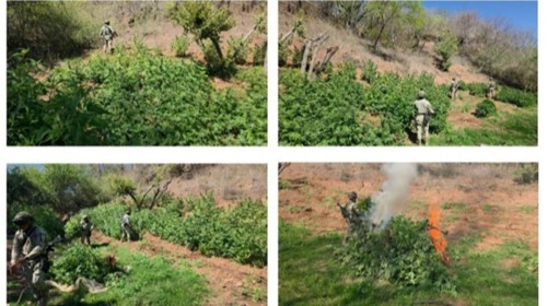 Badiraguato, Sinaloa.- Tres plantíos de marihuana fueron localizados y destruidos por elementos del Ejército Mexicano en el municipio de Badiraguato, durante trabajos de reconocimiento terrestre.