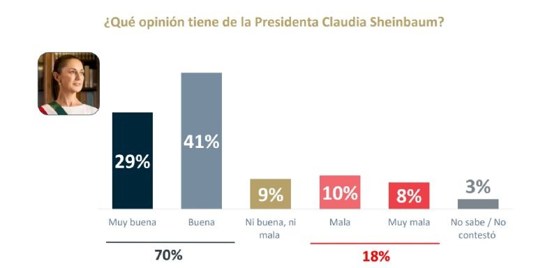 La presidenta de México, Claudia Sheinbaum, mantiene una aprobación del 70 % y una calificación de 7.4 por parte de la ciudadanía, de acuerdo con la última encuesta realizada por De las Heras Demotecnia.